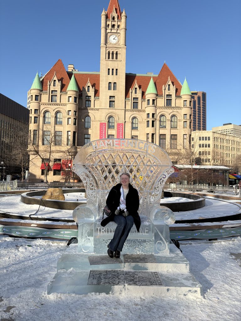 I had the opportunity to attend Queen’s Weekend at the St. Paul Winter Carnival. We had an itinerary full of fun events, like bowling and painting. We got to watch both the Winter Carnival Coronation and the Vulcan Coronation. We also got to hang out and meet the new Winter Carnival court and the new Vulcan Krewe. We also visited the ice sculptures at Rice Park and the St. Paul Hotel. Even though the Grande Day Parade was canceled, we made the best of it by heading to the snow sculptures at the state fairgrounds and having our own mini parade. I’m very thankful to have been given this opportunity!